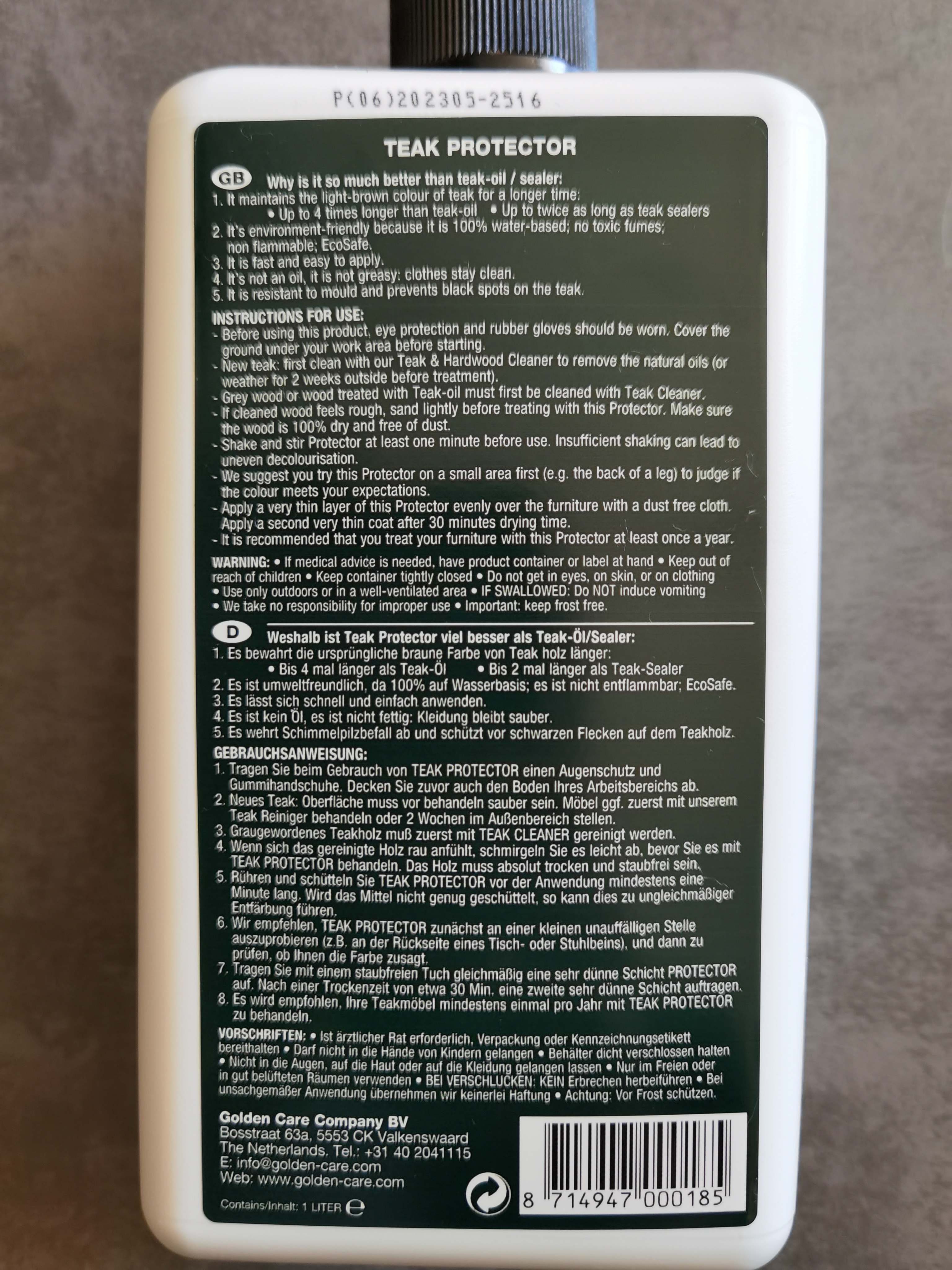 Our Teak Protector is suitable for indoor and outdoor use. 100% water-based and non-oily. It is the perfect care product for your teak furniture or wall covering.