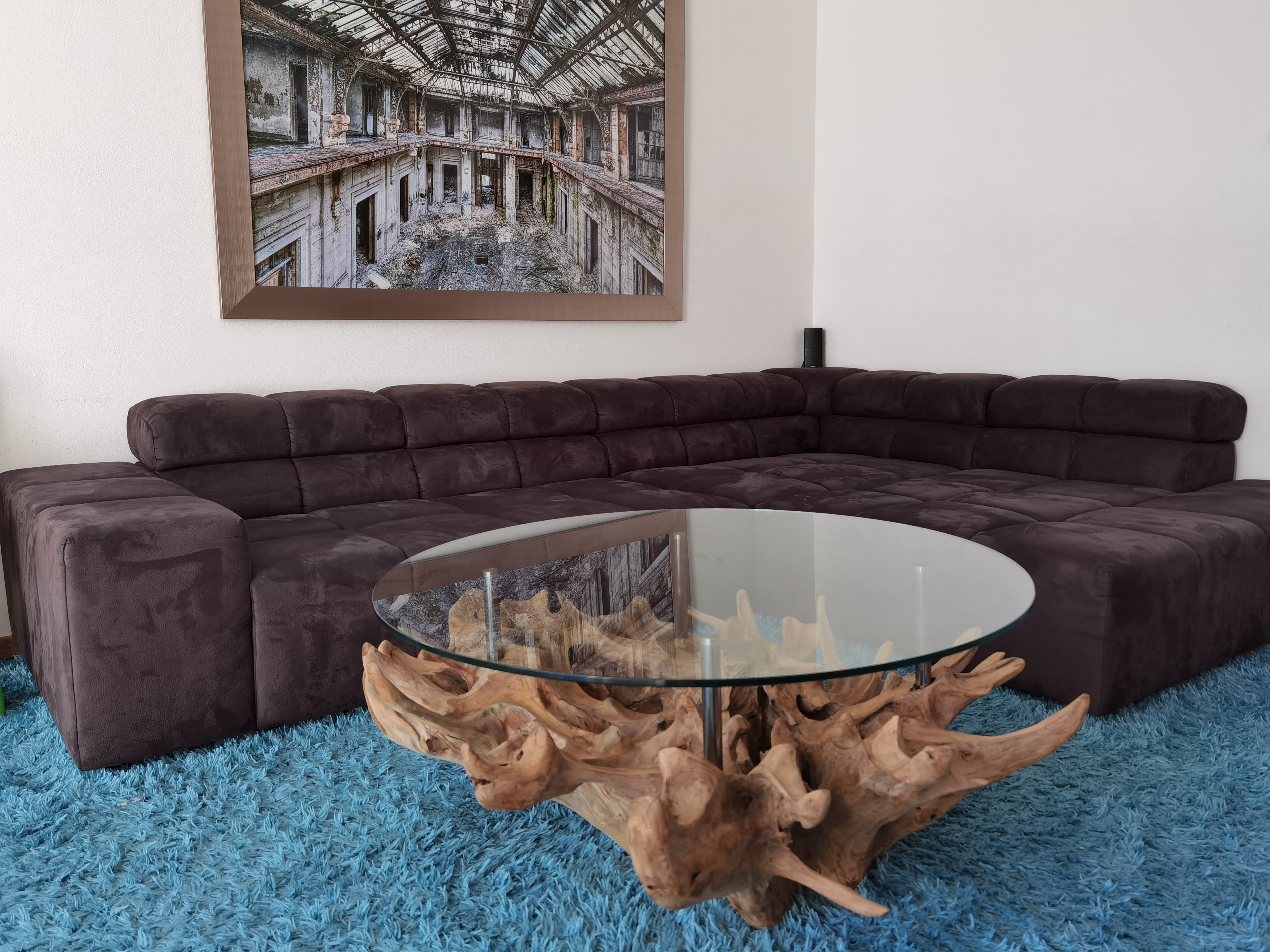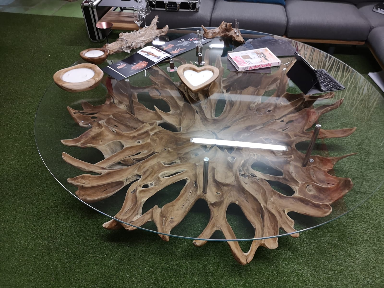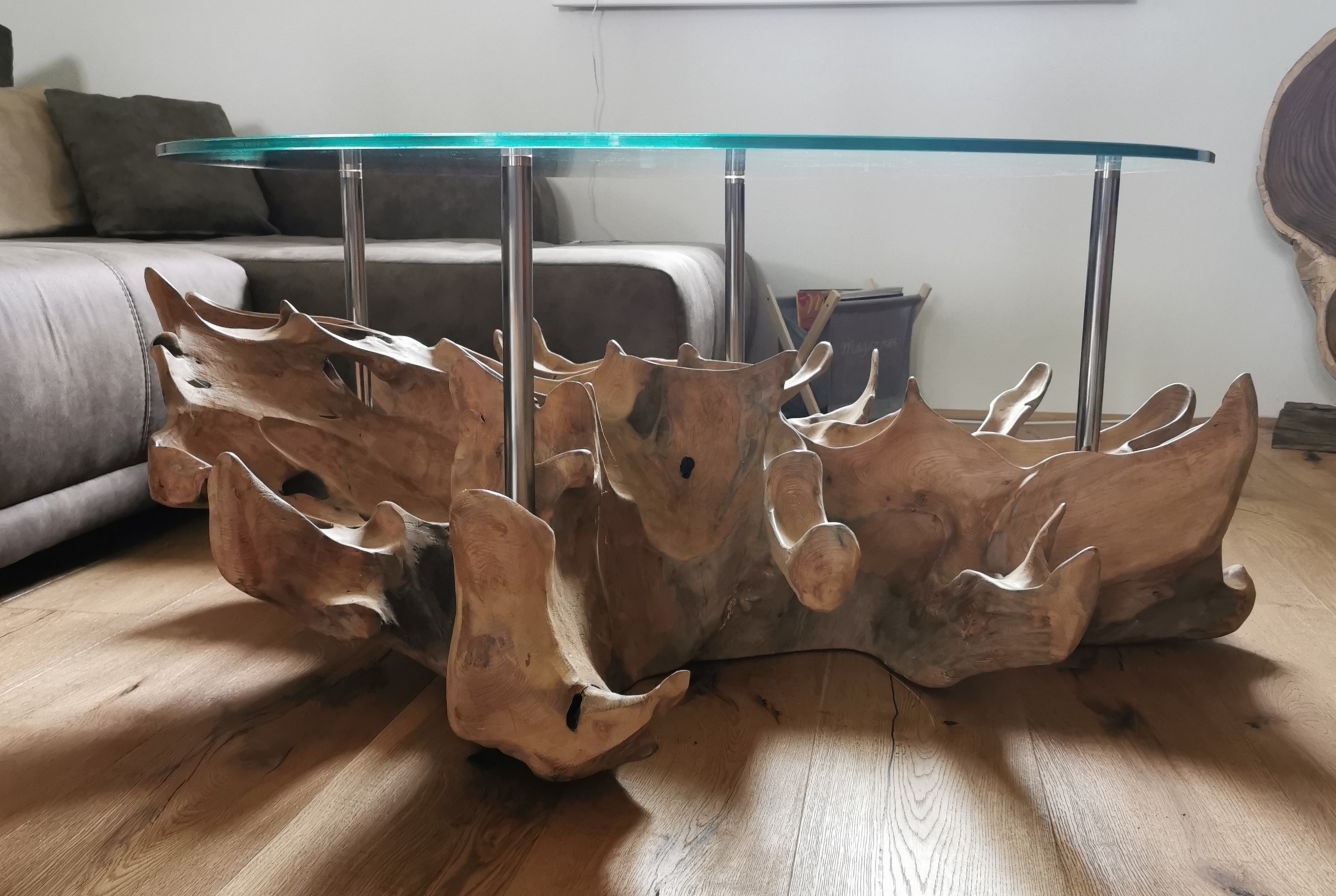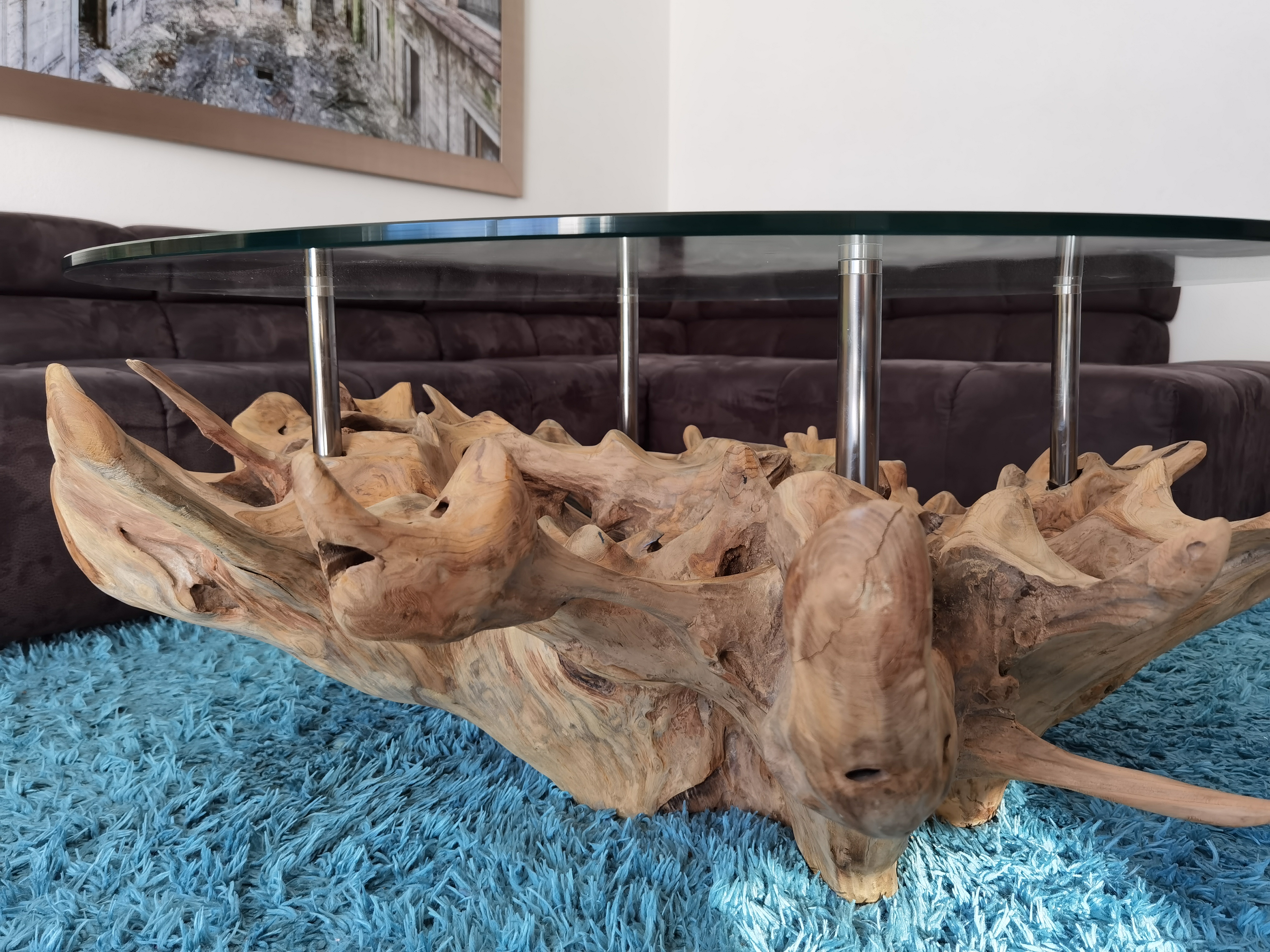 A masterpiece of nature. Wonderful coffee table made of teak root wood with glass top as highlight. The shape of the root is decided by nature – therefore a genuine unique piece!