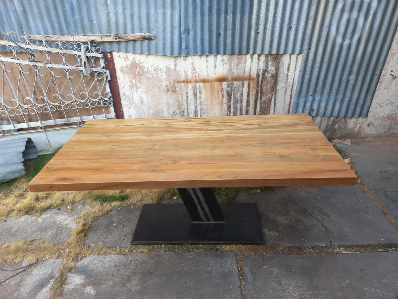 The table has a particularly elegant design. The table top is made of recycled teak and the frame has a vintage look. Really great table.