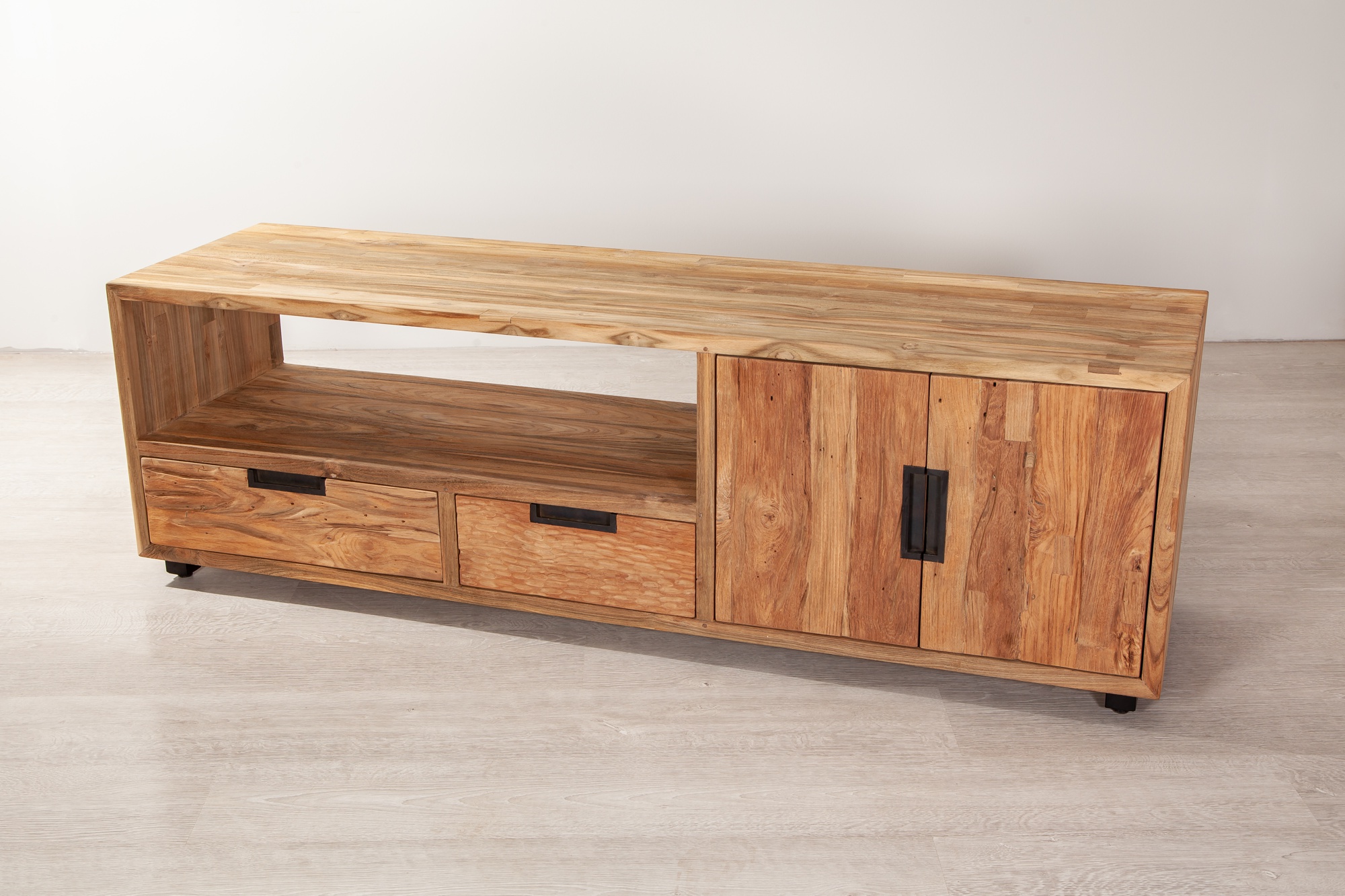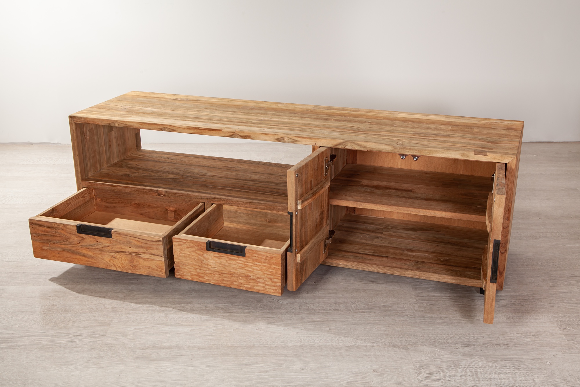 Our trendy TV Board Woody in teak wood has its own very special charm. It gives any living room that special something. Thanks to its doors and drawers which are brushed by hand, the piece of furniture appears even more elegant.